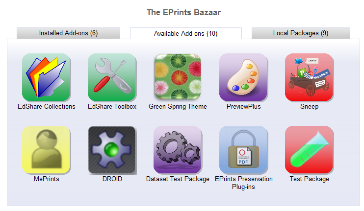 To demonstrate the EPrints Bazaar at Repository Fringe seven existing add-ons were adapted by the developers to be installed via the Bazaar (in many cases this just involved designing an icon!).